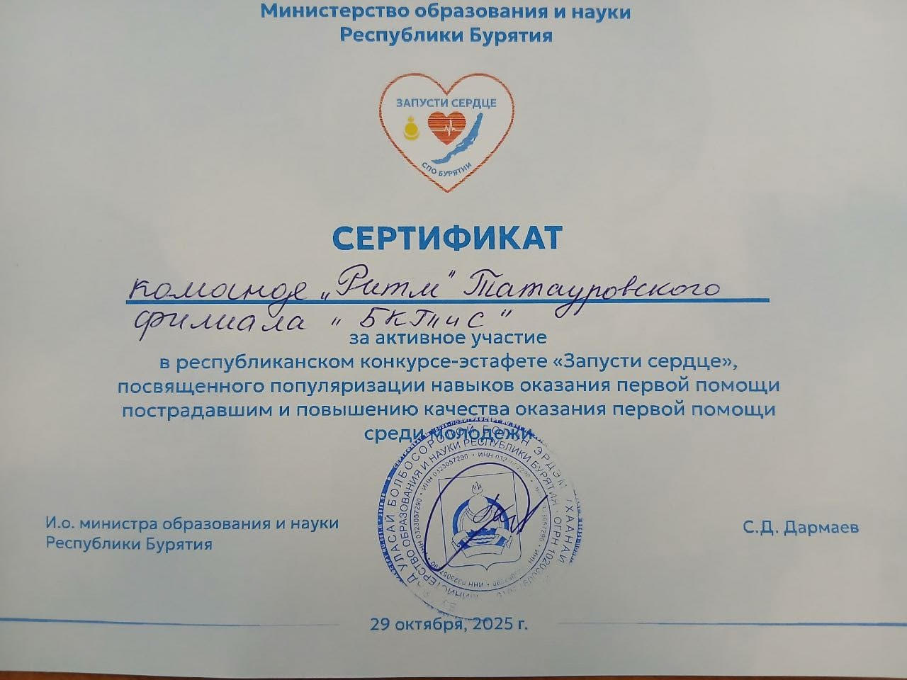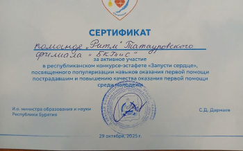 30 октября 2025 года. Команда Татауровского филиала "Ритм" в составе студентов 1 и 2 курсов: Анисимова Влада, Булатова Никиты, Налётова Владимира, Коровиной Валентины, Черепеановой Анжелики под руководством преподавателя Короленко Ирины Вячеславовны приняли участие в Республиканском конкурсе- эстафете"Запусти сердце", посвященного популяризации навыков оказания первой помощи пострадавшим и повышению качества оказания первой помощи среди молодежи.