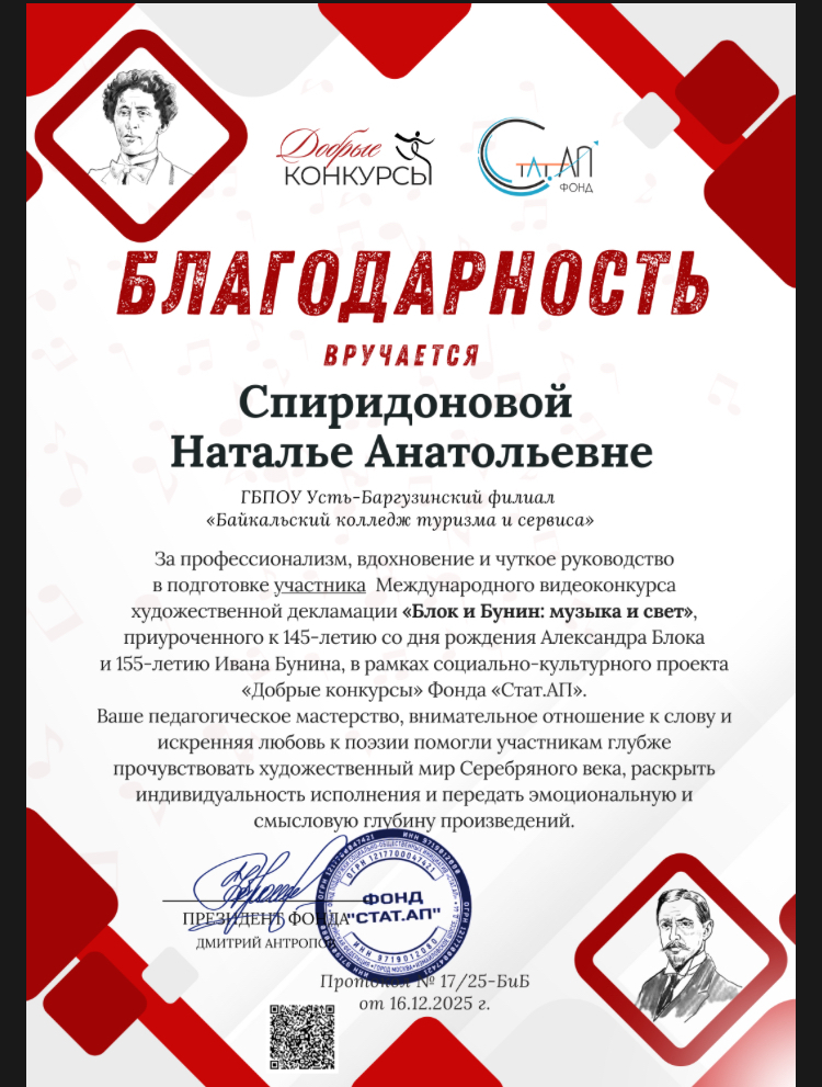 Студенты 1 курса Усть-Баргузинского филиала приняли участие в Международном видеоконкурсе художественной декламации «Блок и Бунин: Музыка и свет», посвященный 145-летию со дня рождения а. Блока и 155-летию со дня рождения И. Бунина.