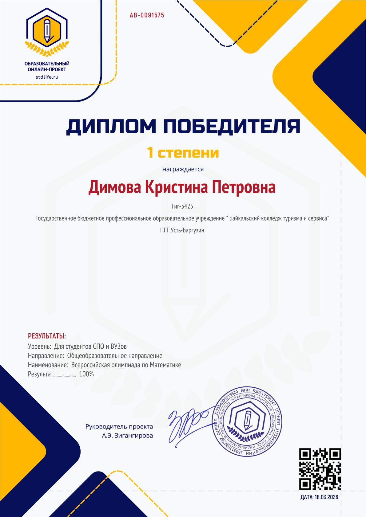 Димова Кристина -диплом 1 степени
