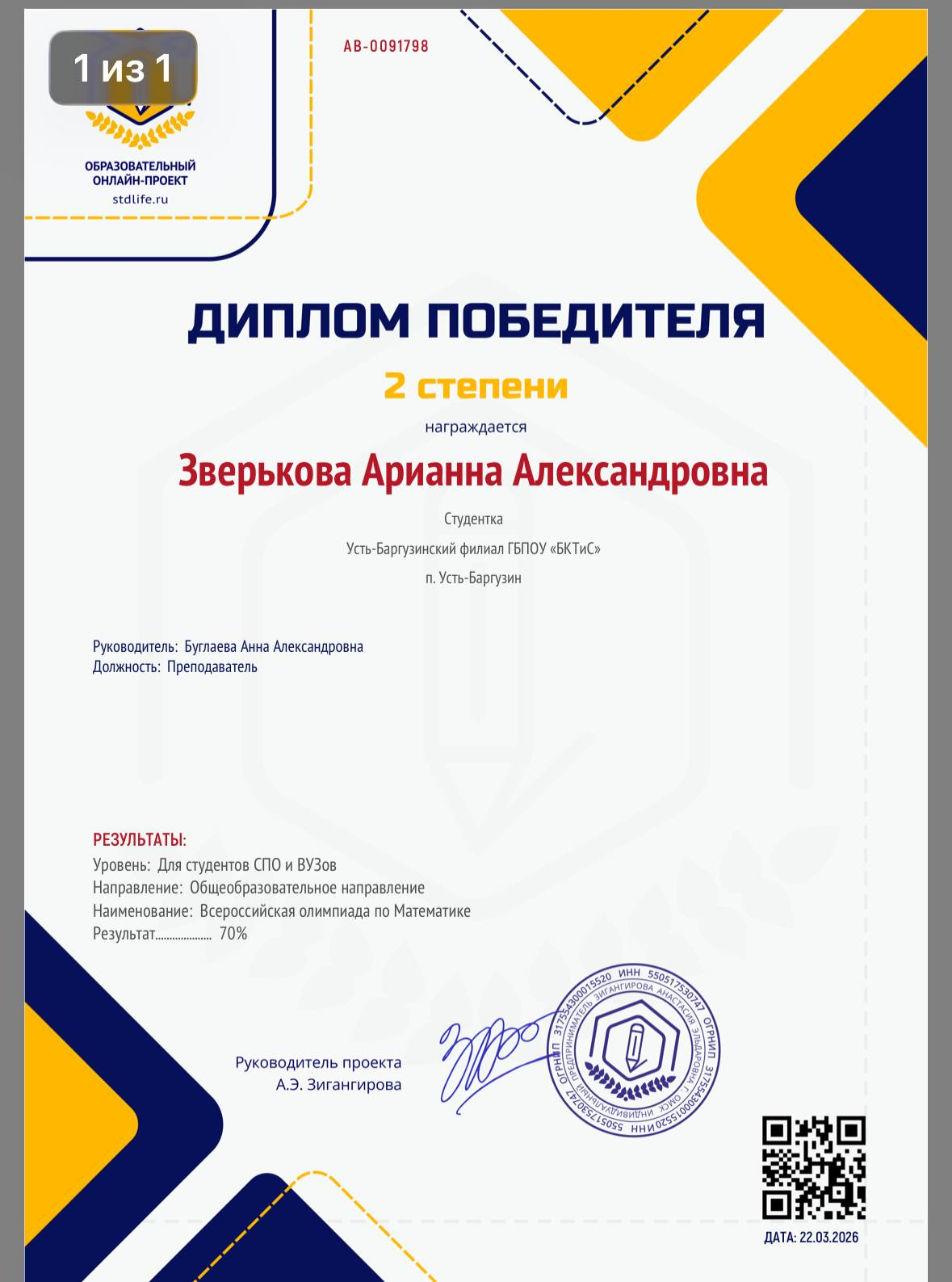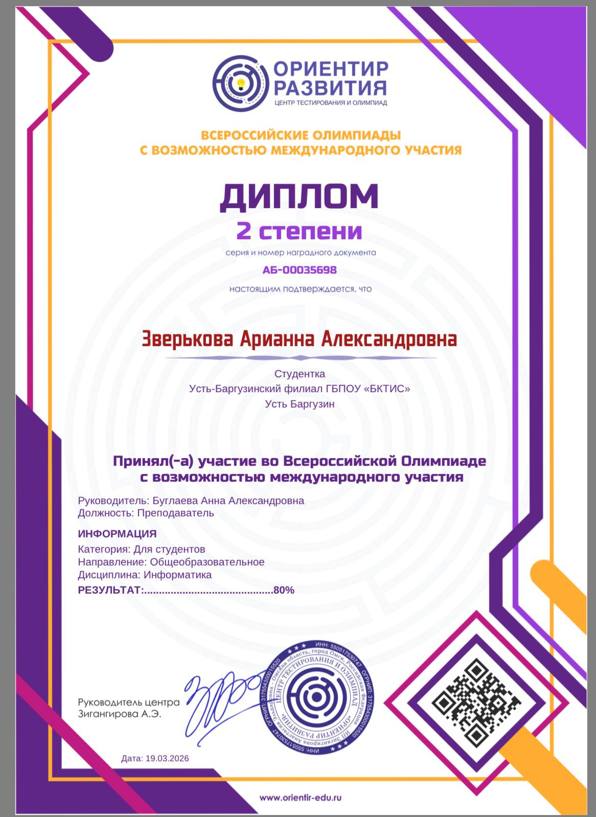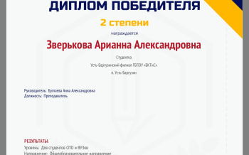 По информатике  Зверькова Арианна получила  диплом 2 степени.