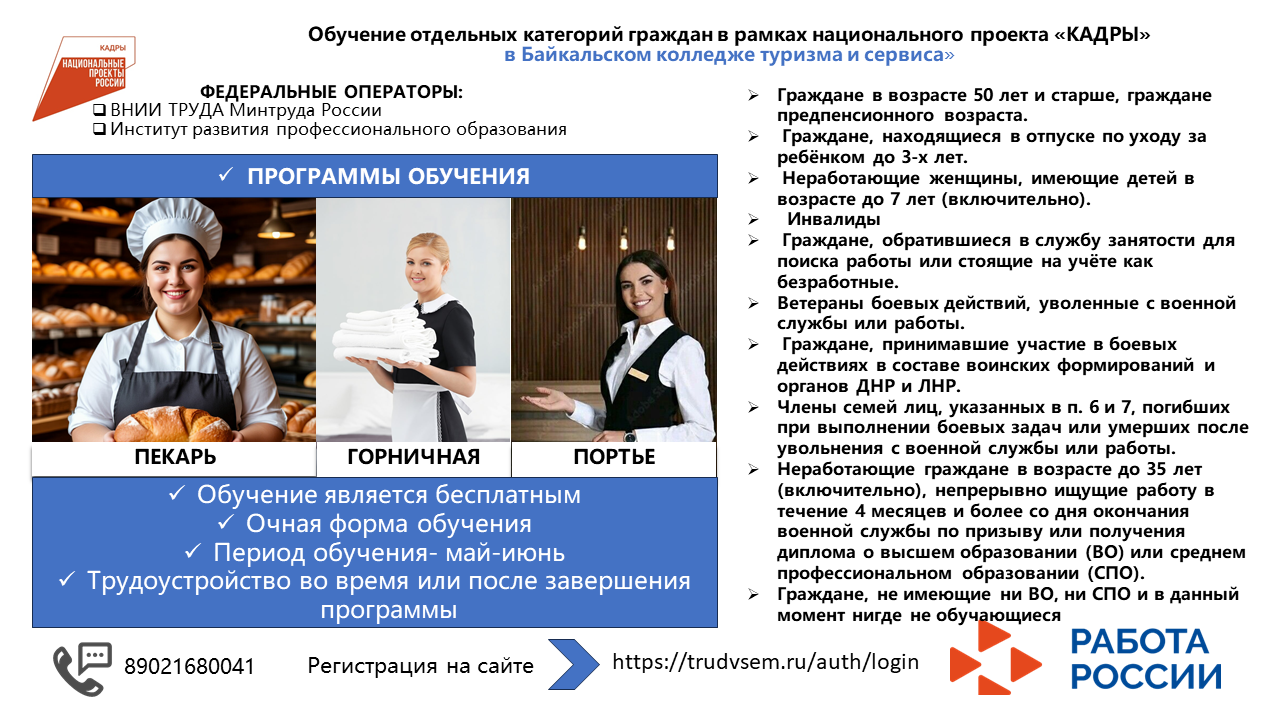 Обучение отдельных категорий граждан в рамках национального проекта «КАДРЫ» в Байкальском колледже туризма и сервиса»